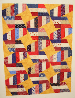 This is another Honor Flight quilt and it's a variation of the Fast Forward quilt I made earlier this month. (I looked at the designer's website - Jaybird Quilts and found this quilt and the pattern is called Unwind.) I just know that when I was making my original quilt, I thought it would be cool to not include the vertical sashing, use gold for the background and only patriotic fabrics for the "ribbons." I envisioned gold stars appearing between the ribbons and look; there they are! I plan to bind this in gold, but who knows?